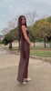 Vestido largo de tejido satinado y de color chocolate muy ajustado al cuerpo. Lleva escote palabra de honor, transparencia con lentejuelas por delante y por detrás y capa incluida. Tiene detalle de transparencias con lentejuelas en abdomen y espalda. Tiene frunce en la falda. Elástico. Ideal para graduaciones, bodas, eventos...