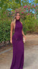 Vestido largo de tejido lurex y de color berenjena muy ajustado, la realza las curvas del cuerpo. Lleva escote halter atado al cuello, espalda descubierta, banda con frunce y detalle dorado. Es muy elástico. Ideal para Navidad, Nochebuena, Nochevieja, eventos, graduaciones, bodas...