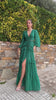 Vestido largo de tejido licra y de color verde botella muy ajustado al cuerpo. Lleva escote en V, volantes en la falda, mangas abombadas y un precioso bordado por todo el cuerpo.