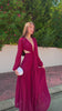 Vestido largo de tejido gasa y de color burdeos. Lleva escote en V hasta la cintura con aberturas sensuales laterales que realzan la figura. Tiene mangas largas abullonadas ajustadas en los puños, drapeado en la cintura con detalle de nudo y falda ligera y fluida que le da un toque muy elegante. Ideal para bodas, graduaciones, eventos...