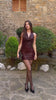 Vestido mini de tejido lentejuelas y de color chocolate muy ajustado, realza las curvas del cuerpo. Lleva escote cascada pronunciado y espalda totalmente descubierta. Es elástico. Ideal para Navidad, Nochebuena y Nochevieja.