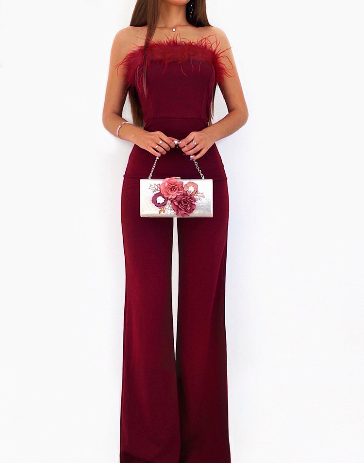 ¡Es tal ideal y favorecedor! Es de color vino, muy ajustado al cuerpo. Lleva escote palabra de honor con plumas y copas que se adaptan genial al pecho. Tiene cremallera trasera invisible, pantalón palazzo y tirantes regulables que se pueden poner o meter por dentro.