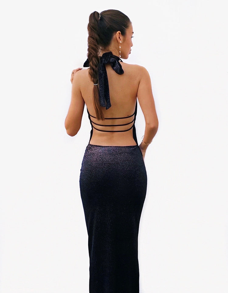Vestido largo de tejido glitter multicolor muy ajustado al cuerpo. Lleva escote en V profundo, espalda totalmente descubierta con detalle de tiras elásticas rectas y tiene frunce en los laterales. Va anudado por el cuello para que puedas ajustar el vestido a tu medida ideal. Perfecto para eventos, cenas elegantes, aniversarios...