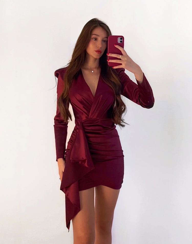 Vestido corto de manga larga, de color vino y tejido raso. Es muy ajustado, realza las curvas del cuerpo. Lleva mangas abullonadas, escote en forma de V, copas para que puedas ir sin sujetador y el cuerpo fruncido, para que se adapte genial. En la parte de la falda tiene detalle en un lateral y el bajo desigual. Lleva cremallera trasera invisible. Ideal para Navidad, fiestas, ocio nocturno, aniversarios, eventos…