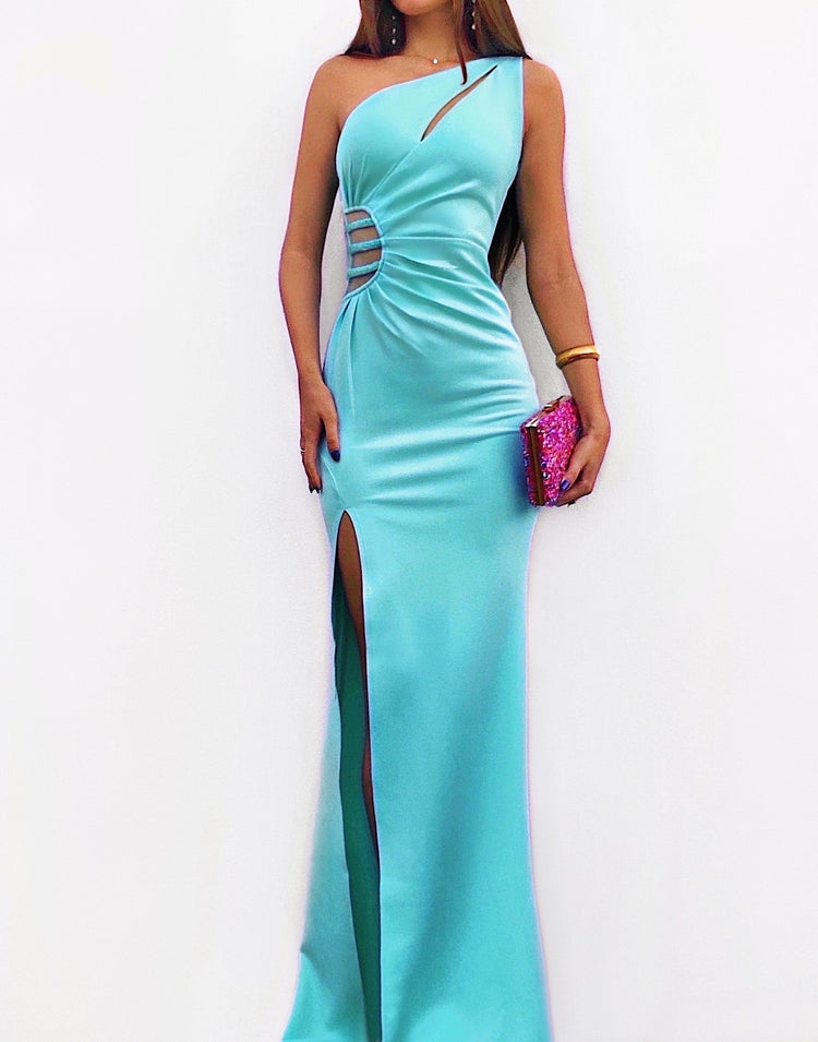 ¡No puede ser más elegante! Vestido largo de color aguamarina y de tejido neopreno muy ajustado al cuerpo. El tejido neopreno es un tejido de alta calidad que se ajusta perfectamente a la silueta, realzando las curvas del cuerpo. Lleva escote asimétrico con abertura y detalle de pedrería con trasparencia en el lateral derecho. Tiene otra abertura en la pierna y copas que se ajustan genial al pecho. Lleva cremallera trasera invisible. Ideal para bodas, graduaciones, bodas, eventos...
