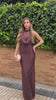 Vestido largo de tejido satinado y de color chocolate muy ajustado al cuerpo. Lleva escote cascada y detalle con bordado floral por delante y por detrás dándole un toque muy elegante. Es elástico. Ideal para graduaciones, bodas, eventos...