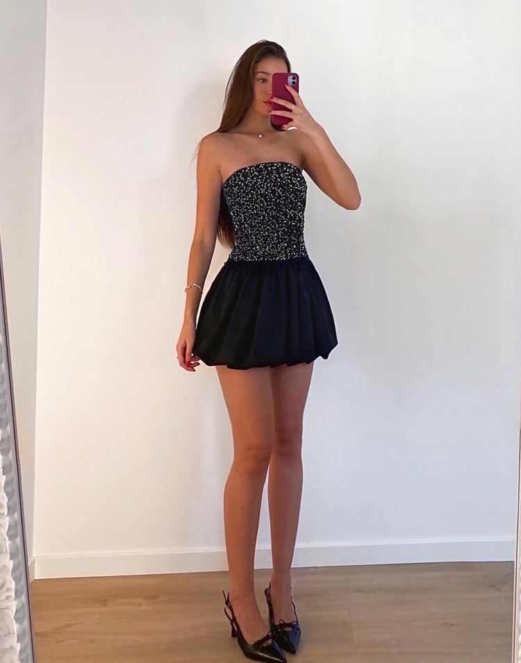 Vestido mini de tejido aterciopelado con lentejuelas y de color plata. Es muy elástico y muy ajustado al cuerpo. Lleva escote palabra de honorvuelo en la falda. Ideal para Navidad, eventos, fiestas, ocio nocturno...