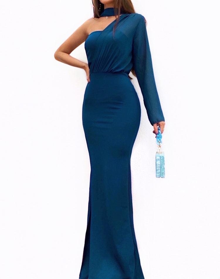 Vestido largo muy ajustado al cuerpo de color azul petróleo y de tejido scubacrepe. Lleva escote asimétrico y detalle de manga con tejido de gasa. Tiene abertura lateral en la pierna derecha y fular en el cuello. Cremallera trasera invisible. Es elástico, se adapta al cuerpo. Ideal para bodas, graduaciones, fiestas, eventos...