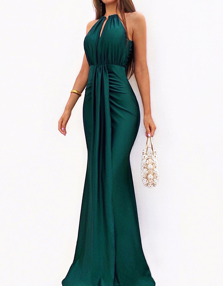 Vestido largo y muy ajustado al cuerpo de color verde botella y tejido satinado. Lleva cuello halter muy favorecedor con abertura centralchoker dorado muy elegante al cuello y copas que se adaptan genial al pecho. Es un vestido con caída delantera y espalda totalmente descubierta con efecto fruncido. Es elástico. Ideal para graduaciones, bodas, eventos…